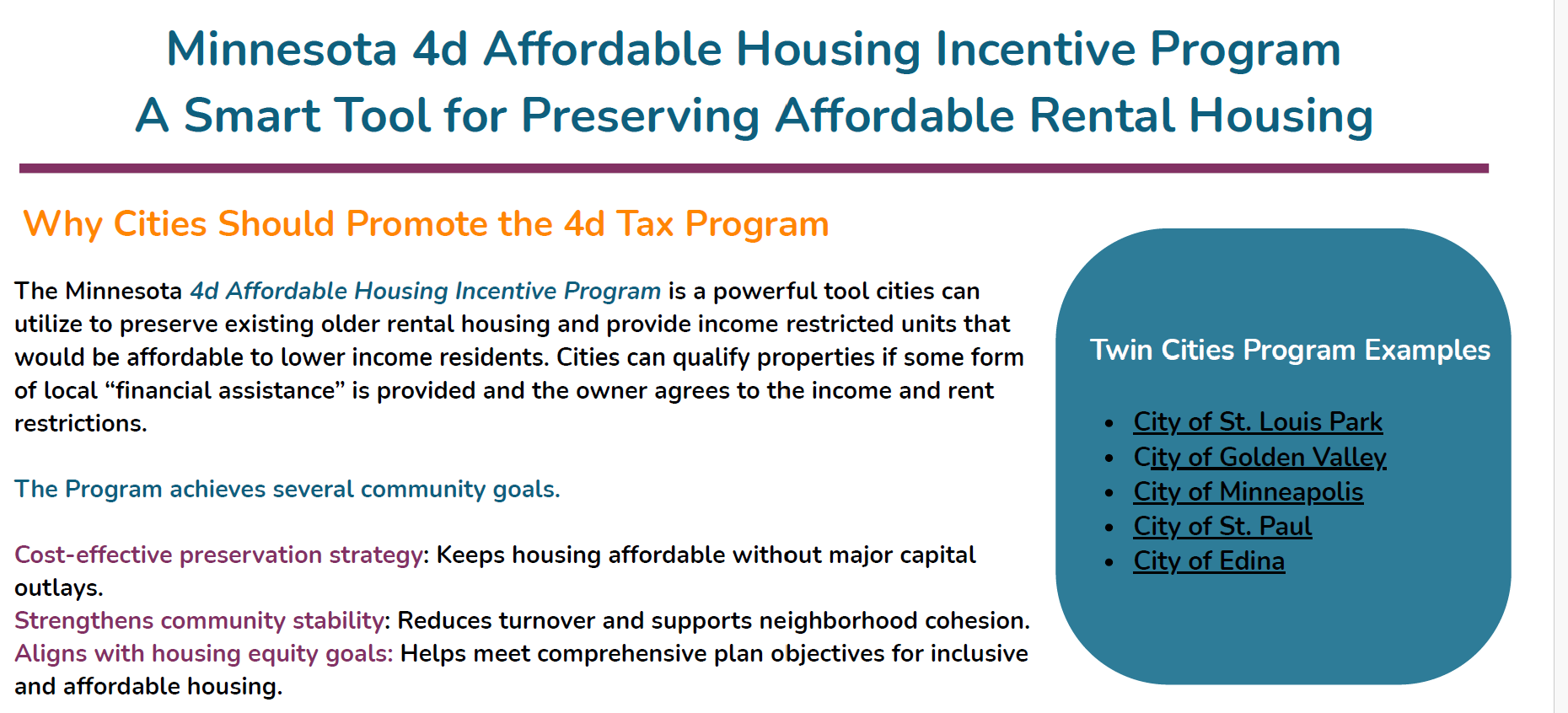 The Minnesota 4d Affordable Housing Incentive Program is a powerful tool cities can utilize to preserve existing older rental housing and provide income restricted units that would be affordable to lower income residents. Cities can qualify properties if some form of local “financial assistance” is provided and the owner agrees to the income and rent restrictions.